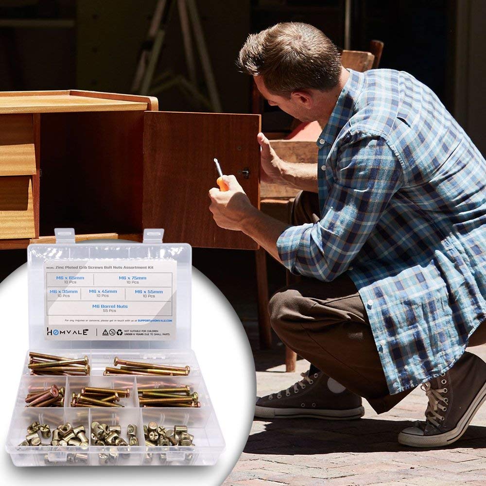 Homvale's kit will allow you to finish all your projects in a very effective and easy way. This assortment set comes with 105 pcs of M6 screws and nuts.